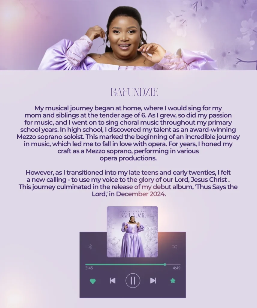 Bafundzie’s early years in choir and school performances laid the technical foundation that later translated into formal classical training. She went on to perform as a mezzo soprano in several opera productions, developing breath control, dynamic range and dramatic phrasing. Those disciplines and skills are audible on Thus Says the Lord, where classical technique meets contemporary gospel arrangement. The result is a body of work that keeps phrasing and diction in sharp focus while embracing production elements aimed at worship and congregational listening.